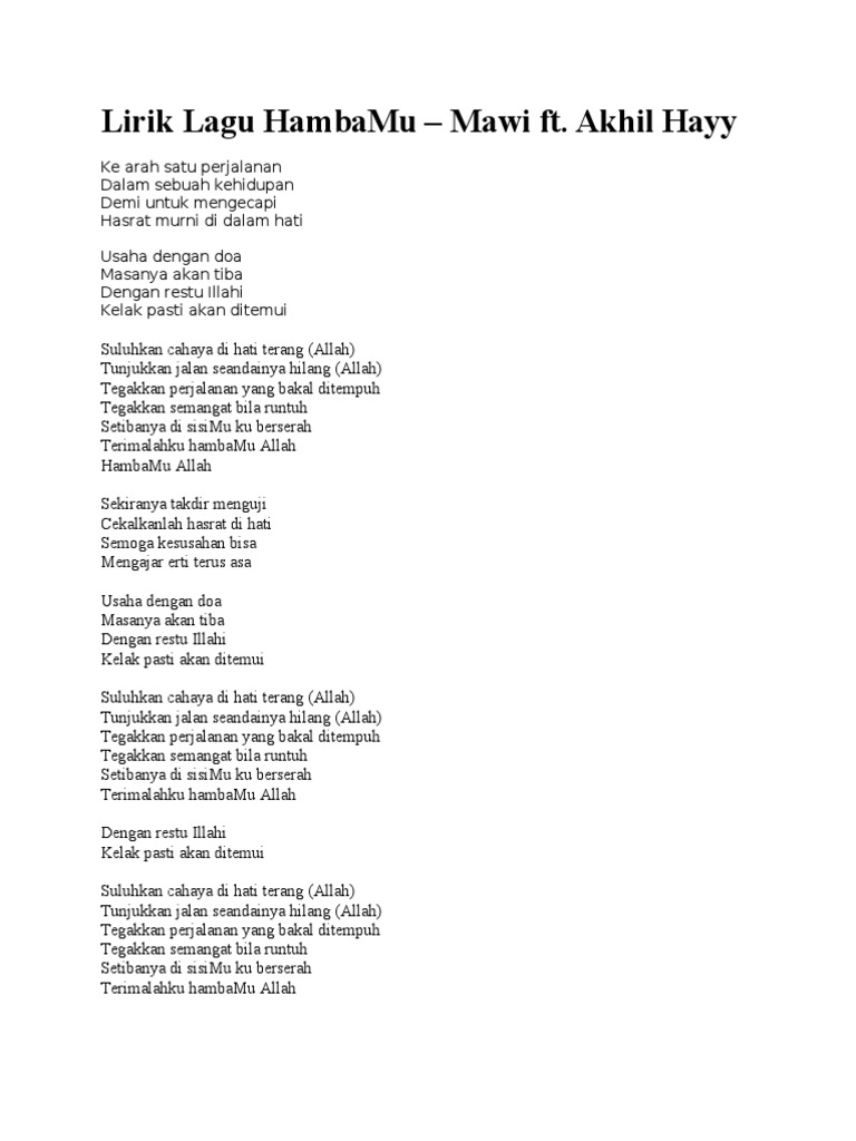Lirik Lagu Ya Allah Ampuni Dosa Hambamu Ini diciptakan oleh Aditya yang sudah ia tulis sejak tahun 2013 dan baru dirilis di bulan Ramadhan tahun ini. Lirik Hambamu dari Mawi ini dipublikasikan pada tanggal 14 Mei 2011 11 tahun yang laluBelum ada info detil tentang single ini. Ya Yesus dengarlah seruan hatiku lengkapi aku yang lemah sebagai laskarMu.